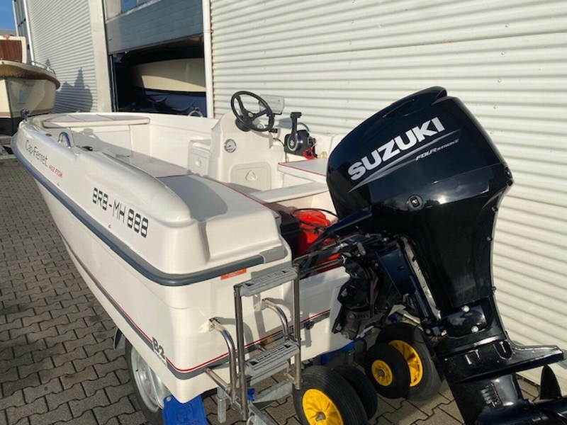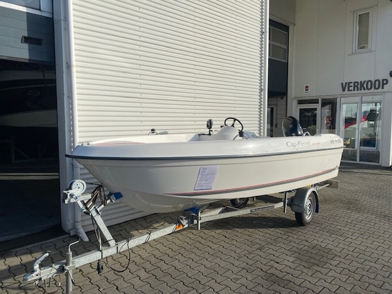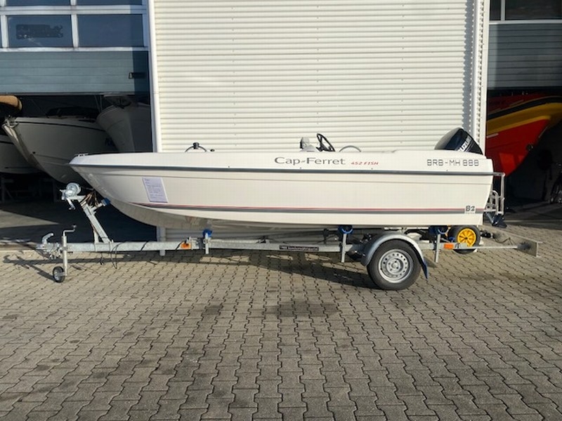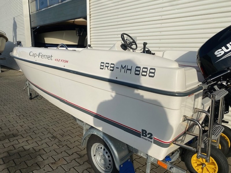 in nieuwstaat verkerende Cap Ferret 452 Fish, volledig ingericht om ontspannen te vissen om of gewoon te toeren. Afmetingen 4.52 x 1,92 mtr, leeg gewicht 300 KG, CE cat : C, 4 personen.