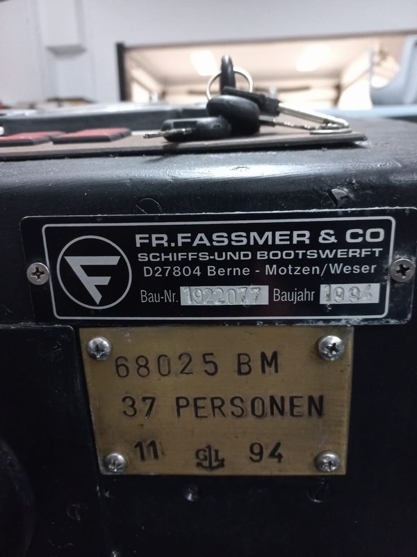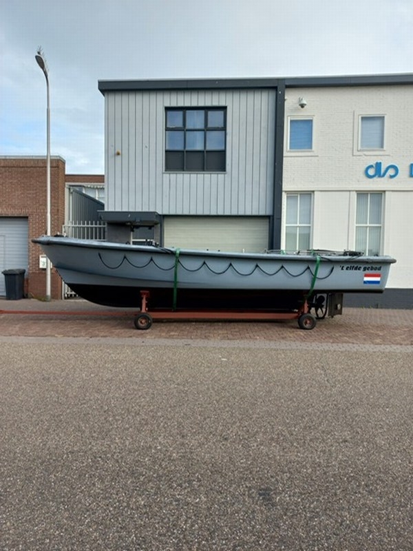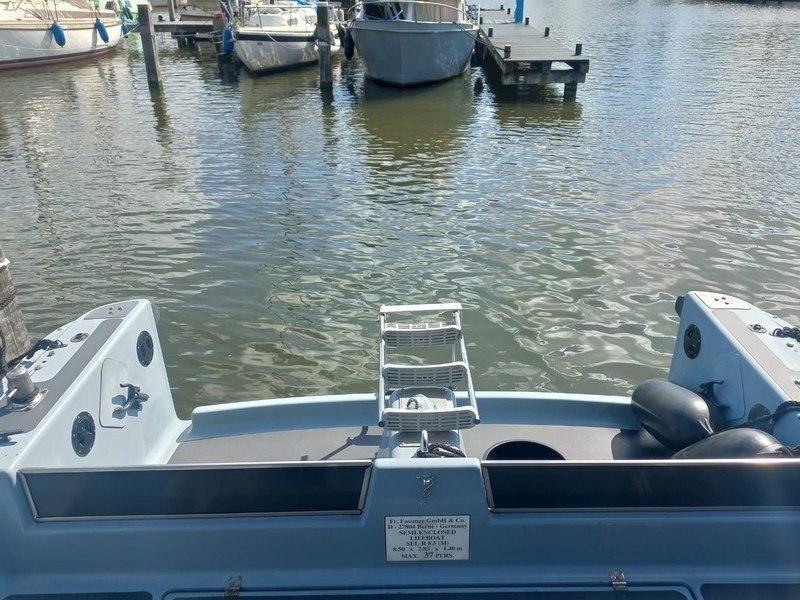 stoere onverwoestbare Fassmer tender 850, geschikt voor 35 Personen, robuust gebouwd met betrouwbare techniek, afmetingen 8,50 x 3,15 x 1,00 mtr, waterverplaatsing c.a 3850 KG. In perfecte staat van onderhoud originele gelcoat.