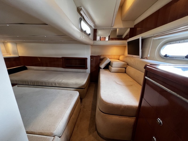 Bij het betreden van de kajuit via de schuifdeur komt u in een lichte, ruime salon met veel opbergruimte en hoogwaardige afwerking. In de Salon een gezellige zithoek in L-vorm (om te bouwen tot extra slaapplaats)Centrale eettafel en kastruimte rondom,Verlichting en ventilatie via dakluiken. Kombuis, gelegen aan stuurboordzijde.Volledig uitgerust met,2-pits kooktoestel,Magnetron / oven, Koelkast met vriesvak, Spoelbak met warm/koud water,Veel kastruimte en werkbladruimte,Ideaal voor koken aan boord, ook tijdens langere tochten.Voorhut (eigenaarshut)Ruim tweepersoons bed in eilandopstelling,Kledingkasten aan beide zijden, luxe afwerking met hout en stoffering,Directe toegang tot de badkamer,Achterhut (gastenhut)Twee aparte bedden (die samen te voegen zijn tot een groot tweepersoonsbed),Extra zitje en grote kast.,Ramen aan beide zijden zorgen voor licht en ventilatie.Badkamer,Toegang via de salon of voorhut,Voorzien van douche, elektrisch toilet en wastafelWarm/koud stromend water en afzuiging.Bovendeks / CockpitHet bovendek van de Sealine S38 is ontworpen voor ontspanning en gemak — ideaal voor zonnige dagen of gezellige avonden aan boord.Grote U-vormige zithoek met tafel (om te bouwen tot zonnedek). buitenkeuken met spoelbak, koelkast en grill.stuurstand met uitstekend zicht rondom, ergonomisch ingedeeld dashboard en dubbele stoel.Ruime doorgang naar het zwemplatform,Groot geïntegreerd platform met buitendouche (warm/koud).